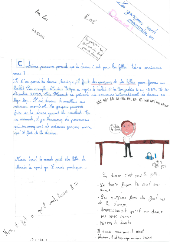 Suite aux deux séances d’échanges et de sensibilisation en présence d’Emilie, le directeur/instituteur a repris la main afin de travailler avec ses élèves sur la création d’articles de presse en lien avec la question des stéréotypes.